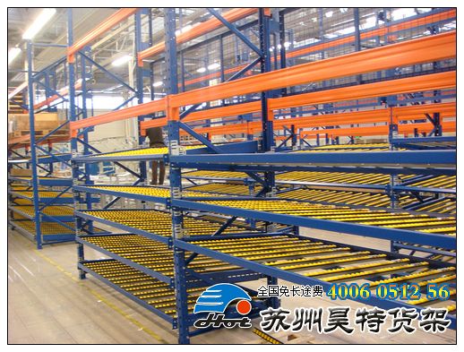 流利條貨架通常由中型橫梁式貨架演變而成,通過滾道將貨物從配貨端輸送到取貨端,貨物借助重力自動下滑,可實現(xiàn)“先進先出”作業(yè),使用成本低,存儲速度快、密度大。貨架每層前后橫梁之間設(shè)置滾輪式鋁合金或鈑金流力條,呈一定坡度(3°左右)放置。貨物通常為紙包裝或?qū)⒇浳锓庞谒芰现苻D(zhuǎn)箱內(nèi),利用其自重實現(xiàn)貨物的流動和先進先出,貨物由小車進行運送,人工存取,存取方便,單元貨架每層載重量通常在1000KG左右,貨架高度在2.5米以內(nèi)。適于裝配線兩側(cè)的工序轉(zhuǎn)換、配送中心的揀選作業(yè)等場所,可配以電子標簽實現(xiàn)貨物的信息化管理。流利條貨架是將貨物置于滾輪上,利用一邊通道存貨,另一邊通道取貨。料架朝出貨方向向下傾斜,貨物在重力作用下向下滑動?蓪崿F(xiàn)先進先出,并可實現(xiàn)一次補貨,多次揀貨。流利架存儲效率高。適合大量貨物的短期存放和揀選,空間利用率達50%。