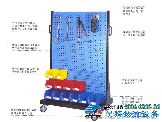 物料整理架物是以方孔掛板和百葉掛板為主要部件,結(jié)合背掛零件盒、掛鉤、棚板等多種配件使用。對您生產(chǎn)現(xiàn)場的小型少量多樣的工具、物料進行分類存放、方便搬運歸位、充分利用空間,整潔高效。